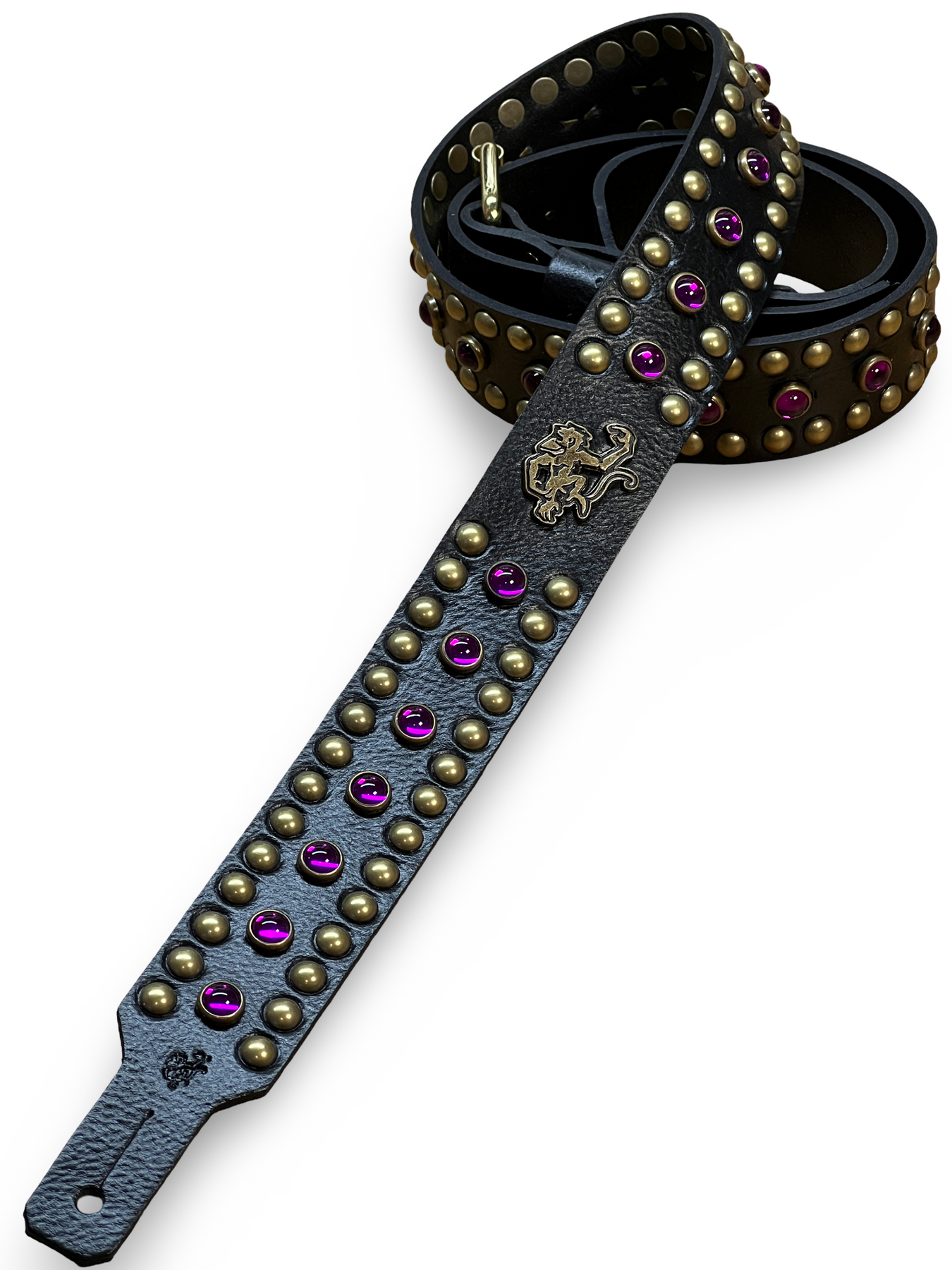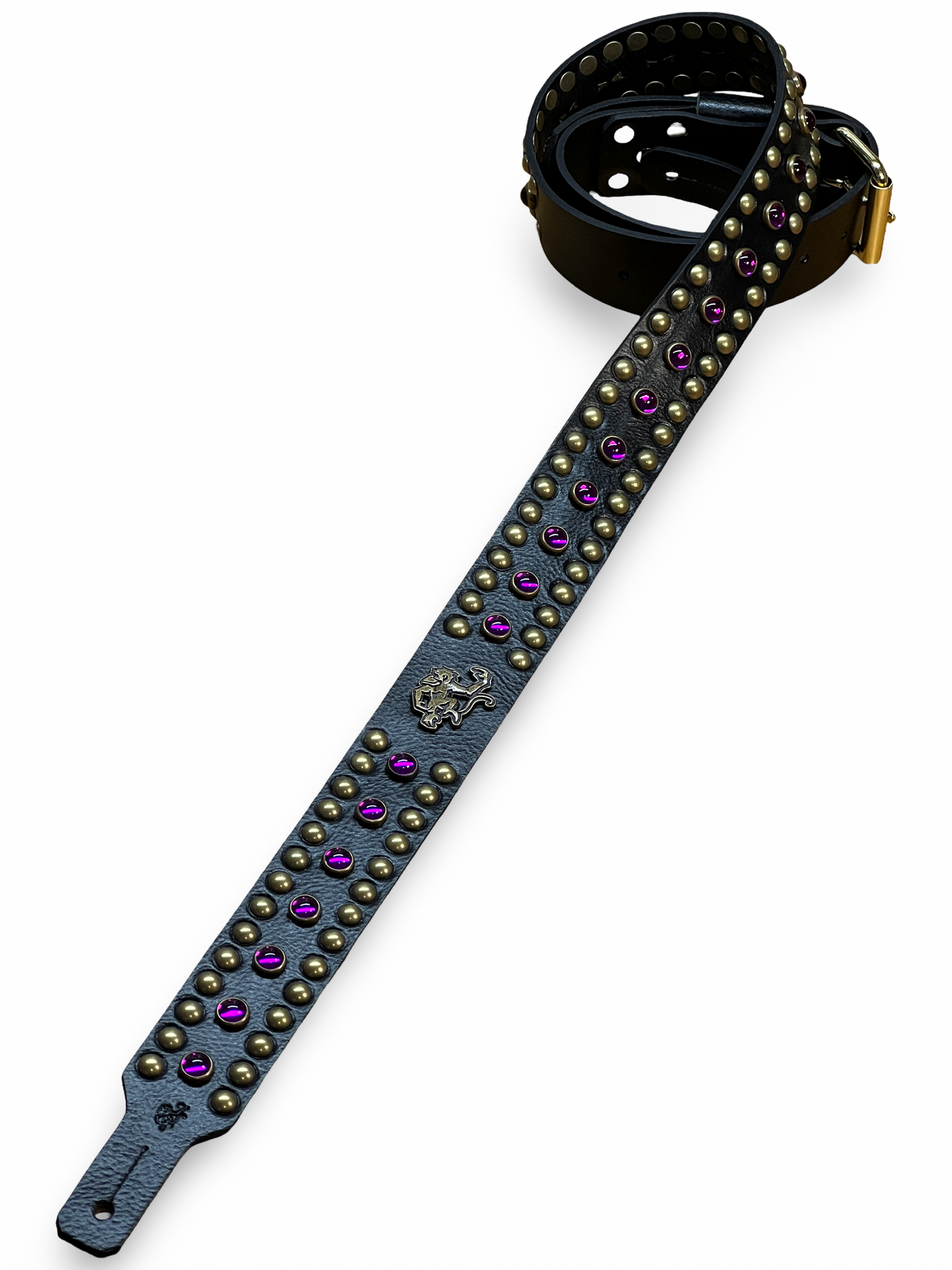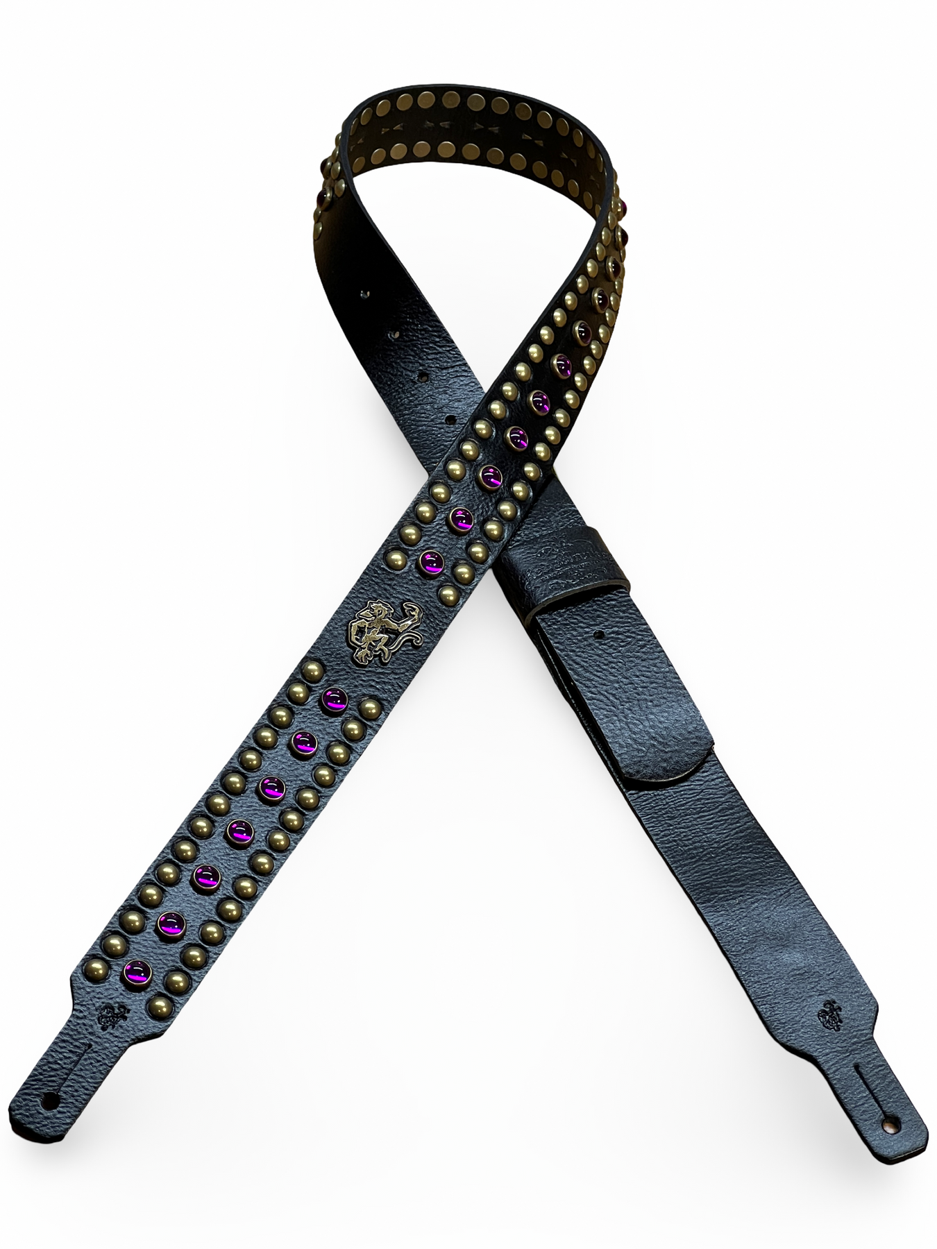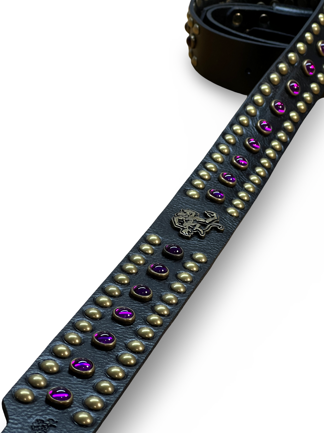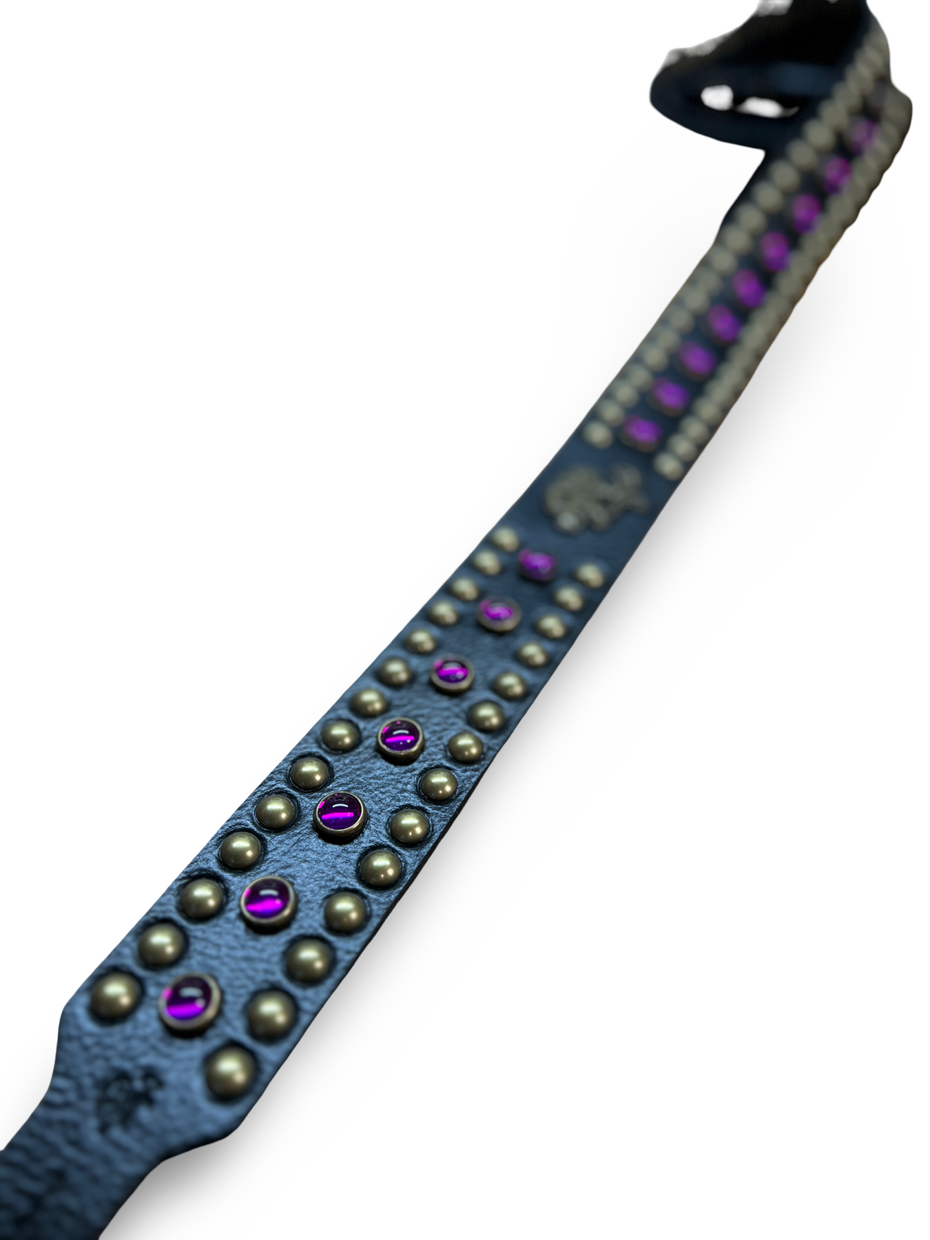As shown: Red Monkey Signature Black Leather/Antique Brass Studs/ Purple stones)